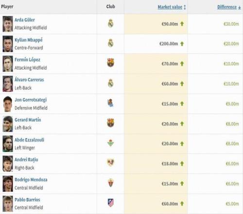 西甲身价涨幅前十